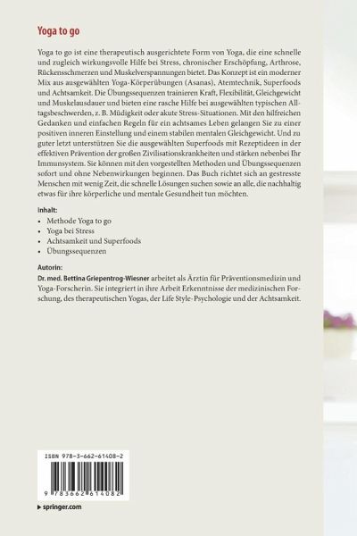 Yoga to go ist eine therapeutisch ausgerichtete Form von Yoga, die eine schnelle und zugleich wirkungsvolle Hilfe bei Stress, chronischer Erschöpfung, Arthrose, Rückenschmerzen und Muskelverspannungen bietet. Das Konzept ist ein moderner Mix aus ausgewählten Yoga-Körperübungen (Asanas), Atemtechnik, Superfoods und Achtsamkeit. Die Übungssequenzen trainieren Kraft, Flexibilität, Gleichgewicht und Muskelausdauer und bieten eine rasche Hilfe bei ausgewählten typischen Alltagsbeschwerden, z. B. Müdigkeit oder akute Stress-Situationen. Mit den hilfreichen Gedanken und einfachen Regeln für ein achtsames Leben gelangen Sie zu einer positiven inneren Einstellung und einem stabilen mentalen Gleichgewicht. Und zu guter letzt unterstützen Sie die ausgewählten Superfoods mit Rezeptideen in der effektiven Prävention der großen Zivilisationskrankheiten und stärken nebenbei Ihr Immunsystem. Sie können mit den vorgestellten Methoden und Übungssequenzen auch im Videoformat sofort und ohne Nebenwirkungen beginnen. Das Buch richtet sich an gestresste Menschen mit wenig Zeit, die schnelle Lösungen suchen sowie an alle, die nachhaltig etwas für ihre körperliche und mentale Gesundheit tun möchten.
