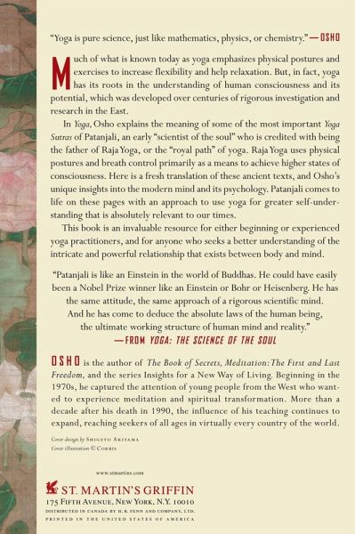In Yoga: The Science of the Soul, one of the greatest spiritual teachers of the twentieth century presents the history and philosophy of this timeless health practice. Much of what is known as yoga today emphasizes physical postures and exercises to increase flexibility and help relaxation. But in fact, yoga has its roots in centuries of rigorous investigation and research in the East to develop an understanding of human consciousness and its potential. In Yoga, Osho explains the meaning of some of the most important Yoga Sutras of Patanjali, an early "scientist of the soul" who is credited with being the father of Raja Yoga, or the "royal path" of yoga that uses physical postures and breath primarily as a means to achieve higher states of consciousness. With a fresh translation of these ancient texts, and unique Osho insights into the modern mind and its psychology, Patanjali comes to life on the pages with an approach to using yoga for greater self-understanding that is absolutely relevant to our times. An invaluable resource for beginning or experienced yoga practitioners, and for anyone who seeks to better understand the intricate and powerful relationship that exists between body and mind. Osho challenges readers to examine and break free of the conditioned belief systems and prejudices that limit their capacity to enjoy life in all its richness. He has been described by the Sunday Times of London as one of the "1000 Makers of the 20th Century" and by Sunday Mid-Day (India) as one of the ten people-along with Gandhi, Nehru, and Buddha-who have changed the destiny of India. Since his death in 1990, the influence of his teachings continues to expand, reaching seekers of all ages invirtually every country of the world.