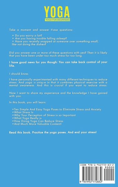 Learn How to Practice Yoga Beginner Poses! Learn 10 super easy yoga poses for absolute beginners. If you're new to yoga, this is the best place to get started. To do these poses, you do NOT need to: - be flexible, or - have any prior yoga experience Here's an insight: according to one scientific study, yoga can lower cortisol levels (a stress hormone). EVEN when practiced for the very first time. Fact. Get Your Copy of 'Yoga For Beginners' Do you worry a lot? Are you having trouble falling asleep? If your answer is yes, it is likely that you have been under too much stress for too long. I have good news for you though: You can take back control of your life. I should know... I have personally experimented with many different yoga techniques to reduce stress. I was so inspired that I wanted to learn everything I could about how it works. I now have almost 1,000 hours of different Yoga Teacher Trainings under my belt. What have I learned? Unlike any other form of exercise I know of, yoga can: - calm the mind and body, and - eliminate stress and anxiety. Now I want to share my experience and the knowledge I have gained with you. So I can help you improve the quality of your life! Here's what I want you to do: Read this book. Practice the yoga poses. And end your stress! Get Your Hands on 'Yoga For Beginners' Yoga doesn't just reduce stress. This wonderful and ancient practice has also been shown to alleviate symptoms of: - Scoliosis - Fibromyalgia - Back pain - Heart disease, and - It normalizes blood pressure Also, many people lose weight when they start practicing yoga. Here Is A Preview Of What You'll Learn: - Ten Simple And Easy Yoga Poses to Eliminate Stress and Anxiety - What is Stress? - Why Your Perception of Stress is so Important - What Yoga Really is - How Doing Yoga Can Reduce Stress - Yoga is For EVERYBODY: Men, Women, Kids. All Can Benefit! - Why Yoga Differs From Other Types of Exercise in Reducing Stress and Anxiety - How to Meditate - And Much More Valuable Content! And as a FREE BONUS, you're getting: - Bonus 1: 5 x 1-minute yoga exercises you can do behind your desk - Bonus 2: 7 other tips to help you reduce stress if you don't feel like practicing yoga on an off-day. Wait, that's not it! You'll also receive: - Bonus 3: 'How Much Sleep Do We Need?' chapter from my other book, 'Insomnia: 84 Sleep Hacks to Fall Asleep Fast, Sleep Better and Have Sweet Dreams Without Sleeping Pills'. Yoga and good sleep go hand-in-hand when it comes to reducing stress and anxiety. If you apply what you will learn in 'Yoga For Beginners', your life will never be the same. So, take out your mat and get ready for your first pose! Shall we get started?