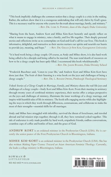 Yoked is a candid look at the ins and outs, the joys and struggles of a clergy couple navigating a family, two separate callings, and their marriage. With vulnerability, courage, hope, and faith Mihee Kim-Kort and Andy Kort share their experiences in life and ministry together, covenanted with both each other and God.