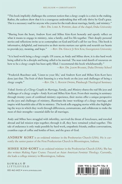 Yoked is a candid look at the ins and outs, the joys and struggles of a clergy couple navigating a family, two separate callings, and their marriage. With vulnerability, courage, hope, and faith Mihee Kim-Kort and Andy Kort share their experiences in life and ministry together, covenanted with both each other and God.