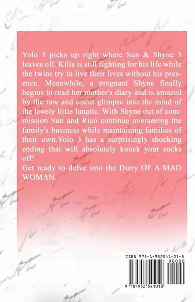 YOLO 4 picks up right where Sun & Shyne 3 leaves off. Killa is still fighting for his life while the twins try to live theirs without his presence. Meanwhile, a pregnant Shyne finally begins to read her mother's diary and is amazed by the raw and uncut mind of the lovely lunatic. With Shyne out of commission Sun and Rico continue overseeing the family's business while maintaining families of their own. YOLO 4 has a surprisingly shocking ending that will absolutely knock your socks off. Get ready to delve into the DIARY OF A MAD WOMAN.