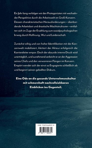 Ein Jahr lang verfolgen wir den Protagonisten mit wechselnder Perspektive durch die Arbeitswelt im Groß-Konzern.Dessen charakteristischen Herausforderungen - überbordende Arbeitslast und drastische Machtstrukturen - entfalten sich im Zuge der Erzählung zum sozialpsychologischen Irrweg durch Hoffnung, Wut und Leidenschaft.Zunächst eifrig und von hoher Identifikation mit der Konzernwelt mobilisiert, klettert der Akteur erfolgreich die Karriereleiter empor. Doch der absurde interne Druck wird unerträglich, und zunehmend zerbricht er an der Aggression seines Chefs und den verworrenen Fängen im Konzern.Empört wendet sich der einst so Engagierte schließlich ab und beginnt seinen geballten Diskurs.Eine Ode an die gesunde Unternehmenskultur mit schmerzhaft nachvollziehbaren Einblicken ins Gegenteil.