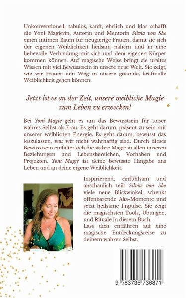 Unkonventionell, tabulos, sanft, ehrlich und klar schafft die Yoni Magierin, Autorin und Mentorin Silvia von She einen intimen Raum für neugierige Frauen, damit sie sich der eigenen Weiblichkeit heilsam nähern und in eine liebevolle Verbindung mit sich und dem eigenen Körper kommen können. Auf magische Weise bringt sie uraltes Wissen mit viel Bewusstsein in unsere neue Welt. Sie zeigt, wie wir Frauen den Weg in unsere gesunde, kraftvolle Weiblichkeit gehen können.Jetzt ist es an der Zeit, unsere weibliche Magie zum Leben zu erwecken!Bei Yoni Magie geht es um das Bewusstsein für unser wahres Selbst als Frau. Es geht darum, präsent zu sein mit unserer weiblichen Energie. Es geht darum, bewusst das loszulassen, was wir nicht wahrhaftig sind. Durch dieses Bewusstsein entfaltet sich die wahre Magie in allen unseren Beziehungen und Lebensbereichen, Vorhaben und Projekten. Yoni Magie ist deine bewusste Hingabe ans Leben und an deine eigene Weiblichkeit.Inspirierend, einfühlsam und anschaulich teilt Silvia von She viele neue Blickwinkel, schenkt offenbarende Aha-Momente und setzt heilsame Impulse. Sie zeigt die magischsten Übungen, Rituale und Tools in diesem Buch. Lass dich entführen auf eine magische Entdeckungsreise zu deinem wahren Selbst.