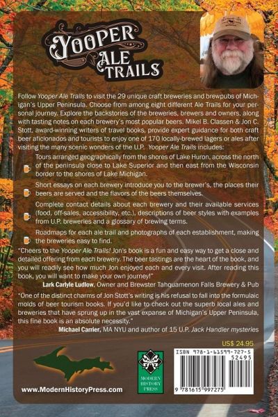 Follow Yooper Ale Trails to visit the 29 unique craft breweries and brewpubs of Michigan's Upper Peninsula. Choose from among eight different Ale Trails for your personal journey. Explore the backstories of the breweries, brewers and owners, along with tasting notes on each brewery's most popular beers. Mikel B. Classen and Jon C. Stott, award-winning authors of travel books, provide expert guidance for both craft beer aficionados and tourists to enjoy one of 170 locally-brewed lagers or ales after visiting the many scenic wonders of the U.P.:Tours are arranged geographically from the shores of Lake Huron, across the north of the peninsula close to Lake Superior and then east from the Wisconsin border to the shores of Lake Michigan. Short essays on each brewery introduce you to the brewer's, the places their beers are served and the flavors of the beers themselves. Complete contact details about each brewery and their available services (food, off-sales, accessibility, etc.), descriptions of beer styles with examples from UP breweries and a glossary of brewing terms. Road maps for each ale trail and photographs of each establishment, making the breweries easy to find "Cheers to the Yooper Ale Trail! Jon's book is a fun and easy way to get a close and detailed offering from each brewery. The beer tastings are the heart of the book, and you will readily see how much Jon enjoyed each and every visit. After reading this book, you will want to make your own journey!" -- Lark Carlyle Ludlow, Owner and Brewster Tahquamenon Falls Brewery & Pub "Jon C. Stott's Yooper Ale Trails breaks down trips across the peninsula into easily traveled trails so that readers can take their time and enjoy the offerings of each one. Many of these breweries are outstanding restaurants with varied and interesting menus. It seems that in the U.P., all roads lead to beer, and Jon Stott hits these places on all cylinders, providing backgrounds, histories and recommendations for a complete and in-depth guide to U.P. beer. Whether you are a hophead, foodie or sightseer, this is an essential book for your travel library." -Mikel B. Classen, author of Points North: Discover Hidden Campgrounds, Natural Wonders and Waterways of the Upper Peninsula and recipient of the Charles Follo U.P. History Award "One of the distinct charms of Jon Stott's writing is his refusal to fall into the formulaic molds of beer tourism books. If you'd like to check out the superb local ales and breweries that have sprung up in the vast expanse of Michigan's Upper Peninsula, this fine book is an absolute necessity." --Michael Carrier, MA NYU and author of 15 U.P. Jack Handler mysteries From Modern History Press www.ModernHistoryPress.com