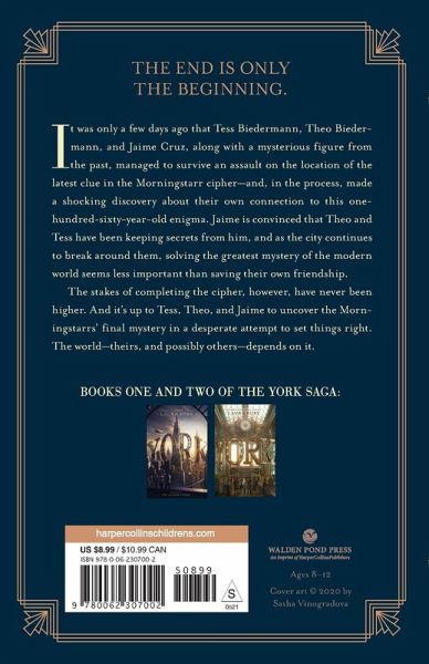 The thrilling conclusion to two-time National Book Award finalist Laura Ruby’s epic adventure through the streets of an alternate New York City. It was only a few days ago that Tess Biedermann, Theo Biedermann, and Jaime Cruz, along with a mysterious figure from the past, managed to survive an assault on the location of the latest clue in the Morningstarr cipher—and, in the process, made a shocking discovery about their own connection to this one-hundred-sixty-year-old enigma. Now the friends are divided. Tess and Theo have no idea what the photo they found in Greenwood Cemetery means, but Jaime is convinced that they do, and that they’ve been keeping their own secrets from him. As the city continues to break around them, suddenly solving the greatest mystery of the modern world seems less important than saving their own friendship. The stakes of completing the cipher, however, have never been higher. Darnell Slant, real estate developer and owner of all the Morningstarr buildings, knows that they hold one last secret: a power that even the Morningstarrs themselves never revealed. The world has rested on a precarious balance of power for generations; now Slant and his shadowy business partners aim to unbalance it. It’s up to Tess, Theo, and Jaime to uncover the Morningstarrs’ final mystery in a desperate attempt to set things right. The world—theirs, and possibly others—depends on it.