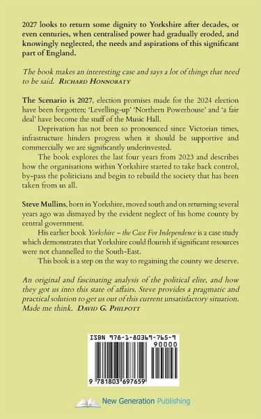 2027 looks to return some dignity to Yorkshire after decades, or even centuries, when centralised power had gradually eroded, and knowingly neglected, the needs and aspirations of this significant part of England. The book makes an interesting case and says a lot of things that need to be said. Richard Honnoraty. The Scenario is 2027, election promises made for the 2024 election have been forgotten; 'Levelling-up' 'Northern Powerhouse' and 'a fair deal' have become the stuff of the Music Hall. Deprivation has not been so pronounced since Victorian times, infrastructure hinders progress when it should be supportive and commercially we are significantly underinvested. The book explores the last four years from 2023 and describes how the organisations within Yorkshire started to take back control, by-pass the politicians and begin to rebuild the society that has been taken from us all. Steve Mullins, born in Yorkshire, moved south and on returning several years ago was dismayed by the evident neglect of his home county by central government. His earlier book Yorkshire - the Case For Independence is a case study which demonstrates that Yorkshire could flourish if significant resources were not channelled to the South-East. This book is a step on the way to regaining the county we deserve. An original and fascinating analysis of the political elite, and how they got us into this state of affairs. Steve provides a pragmatic and practical solution to get us out of this current unsatisfactory situation. Made me think. David G. Philpott