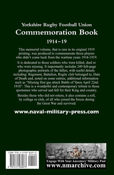 This memorial volume, that is rare in its original 1919 printing, was produced to commemorate those players who didn't come back from the wartime years 1914-1919. It is dedicated to those soldiers who were killed, died or who were missing. It importantly includes 249 full-page photographic portraits of the fallen, with useful details including: Regiment, Battalion, Rugby club belonged to, Date of Death and, noted on some entries, additional information such as "Missing first gas attack Battle of Ypres April 22nd 1918". This is a wonderful and contemporary tribute to those sportsmen who served and fell for their King and country. Besides those who did not return, it also contains a roll, by college or club, of all who joined the forces during the Great War and survived.