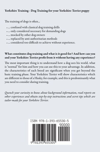 Yorkshire Training - Dog Training for your Yorkshire Terrier puppy The training of dogs is often...... confused with classical dog training drills ... only considered necessary for demanding dogs ... mocked by other dog owners ... replaced by anti-authoritarian methods ... considered too difficult to achieve without experience. What constitutes dog training and what is it good for? And how can you and your Yorkshire Terrier profit from it without having any experience? The most important thing is to understand how a dog sees his world, what is "normal" for him and how you can use this to your advantage. In addition, the characteristics of each breed are significant when you get beyond the basic training phase. Your Yorkshire Terrier will show characteristics which are different to those of a Husky, for example, and this is predominantly what you need to consider during training. This book is vol. 1 of the Yorkshire Terrier training books. Vol. 2 for your grown up Yorkshire is also available with the title "Yorkshire Training Vol. 2: Dog Training for your grown-up Yorkshire Terrier" Author Claudia Kaiser says about her book: "It was my desire to let other dog owners profit from the knowledge I have gained over many years, and after making many mistakes. I love my dog and know how important it is to adapt the training to suit each breed. It is exactly this desire that prompted me to write this book. My aim is to help every beginner, not only to understand his dog better, but also to know exactly how to get the best results, step-by-step, so that you can achieve a close, positive and trusting human-dog relationship." Quench your curiosity to know about background information, read reports on other experiences and obtain step-by-step instructions and secret tips which are tailor-made for your Yorkshire Terrier. Get your copy of this book today and experience...... how your Yorkshire Terrier sees his world ... and how you can progressively train your dog to receive the best results. Your Yorkshire Terrier will appreciate it... ... so this is my advice: Don't hesitate to buy this book! Content of this book:About the Author Preface What you need to know about your Yorkshire Terrier Cornerstones of training puppies Before the puppy arrives The first few weeks The first commands Training basic knowledge Special Chapter – The hunting instinct Check list for the start Conclusion