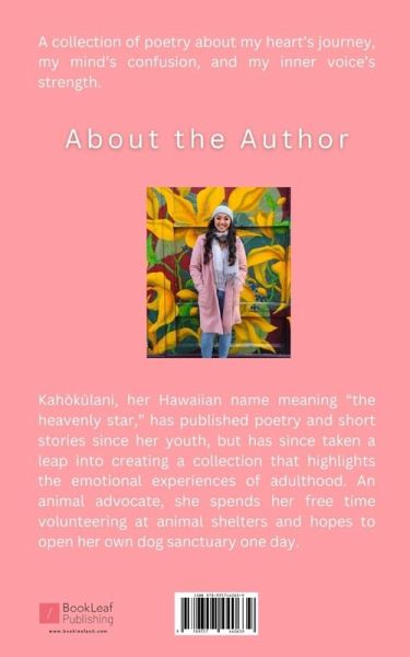Kah¿k¿lani, her Hawaiian name meaning "the heavenly star", has published poetry and short stories since her youth, but has since taken a leap into creating a collection that highlights the emotional experiences of adulthood. An animal advocate, she spends her free time volunteering at animal shelters and hopes to open her own dog sanctuary one day.