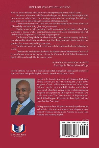 Praise for Jesus and You Are Twins We have always believed a book is a set of writings that define the author's theme.But when it becomes a clarification leading us to a denser and deeper spirituality, then we are not only in front of the writings, but we dive into knowledge that will never leave us as we were before being in possession of these revelations.The relationship between Christ and us is clearly detailed by the theme of this tool of knowledge and spirituality: Jesus and you are twins.Daring to say it and explaining it well, as was done in this book, today allows Christians to reach a level of a spiritual relationship with Christ that makes us enjoy all the benefits of the person of Christ and His great power.The beauty of Joseph Edhuine's book is the fact that it leads us not only to discover our relationship with Christ but also to love Him deeply and put Him in our lives in a position that no one and nothing can replace.The discoveries of this work reveal to us all the beauty and value of belonging to Christ.Thanks to the revelations in this book, the idleness of the Christendom of many will be transformed without forcing into a fervor for Christ with a life full of demonstrative proofs of Christ through His life in us as twins. Pastor Levi Kongolo KazadiJesus Light for Nations Mission Congo
