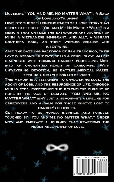 Dive into the spellbinding pages of a love story that defies fate itself. "You and Me No Matter What" is a memoir that unveils the extraordinary journey of Minh, a Vietnamese immigrant, and Ally, a vibrant Southern soul, as their worlds collide and intertwine. Amid the dazzling backdrop of San Francisco, their love blossoms. But fate deals a cruel blow-Ally is diagnosed with terminal cancer, propelling Minh into an uncharted realm of caregiving. With unwavering devotion, he battles medical mazes, seeking a miracle for his beloved.