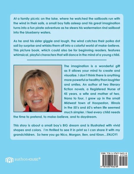 At a family picnic on the lake, where he watched the sailboats run with the wind in their sails, a small boy falls asleep and his great imagination turns into a fun pirate adventure as he steers his watermelon rind sailboat into the blueberry waters. As he and his sister giggle and laugh, the wind catches their polka dot sail by surprise and whisks them off into a colorful world of make-believe. This picture book, which could also be for beginning readers, features whimsical, playful characters that will dance in the mind of a young child.