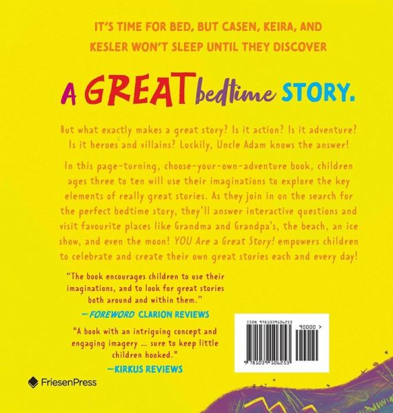 It's time for bed, but Casen, Keira, and Kesler won't sleep until they discover a great bedtime story. But what exactly makes a great story? Is it action? Is it adventure? Is it heroes and villains? Luckily, Uncle Adam knows the answer! In this page-turning, choose-your-own-adventure book, children ages three to ten will use their imaginations to explore the key elements of really great stories. As they join in on the search for the perfect bedtime story, they'll answer interactive questions and visit favourite places like Grandma and Grandpa's, the beach, an ice-show, and even the moon! YOU Are a Great Story! empowers children to celebrate and create their own great stories each and every day! Inspired by the boundless imaginations of my niece and nephews, Casen, Keira and Kesler, this book is dedicated to all those in the Entertainment Industry that were negatively affected, shaken up and displaced by the COVID-19 Pandemic. This is our 'quarantine creation' and we hope it encourages everyone to stay creative, to stay positive and to remain the author of their own new adventures to come.