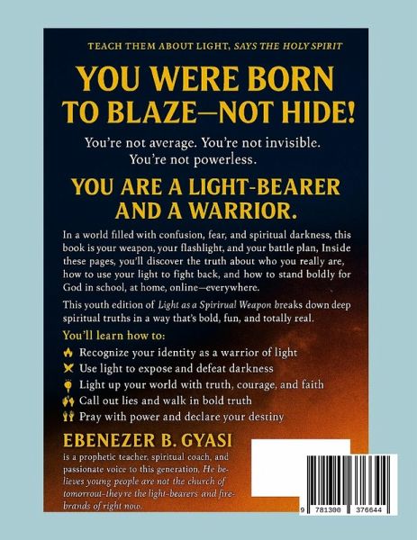You were born into a world where darkness tries to dominate - where fear, confusion, depression, and evil roam like shadows trying to silence the light. But here's the truth: You are not ordinary. You were created by the God of Light, and He has placed within you a radiant fire - a light that darkness cannot overcome. As a child of God, you are not a mistake, a background character, or someone left out of God's great plan. You are chosen. You are appointed. You are anointed. And you have been sent into this generation. What This Book Is About This is not just another devotional or Bible study-it's a full-on spiritual battle plan designed specifically for YOU. Whether you're in middle school, high school, or just discovering who God made you to be, this book is here to help you light up your world and crush darkness with truth, love, and power. You'll learn what it really means to be a light-bearer (someone who carries God's glory) and a warrior (someone who fights for what's right with spiritual weapons). Each chapter is filled with real-talk teaching, spiritual truths, deep insights, and bold prayers to launch you into your purpose. How the Book Is Structured Each chapter includes: Youth-Focused Topics - Real struggles, real warfare, and how to handle it all with God's light. Key Spiritual Insights - Packed with scripture-based truth you can apply immediately. Declarations & Decrees - Speak bold words that change your life and atmosphere. Warrior Prayers - Seven targeted prayers per chapter to activate light, power, and breakthrough. Reflection Questions + Sample Answers - Think deeper, process the truth, and apply it. Journal Prompts + Light Challenges - Real actions to help you live out what you've learned. Worship + Warfare Songs - Music to power up your spirit and atmosphere. STUDY ZONE - Review questions, group discussion starters, and memory verses. Why It's Perfect for You This book was made to be interactive, powerful, and easy to connect with. Whether you're reading solo, using it for youth group, or going through it with a mentor or squad, you'll find: A bold, modern layout that speaks your language. A clear understanding of spiritual warfare and identity. Space to think, write, pray, and grow. Engaging tools to help you shine at school, at home, online, and everywhere in between. So grab your pen, your Bible, and your spiritual armor-because it's time to light up your generation.