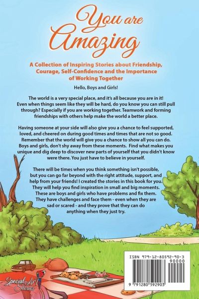 Hello, Boys and Girls! The world is a very special place, and it's all because you are in it! Even when things seem like they will be hard, do you know you can still pull through? Especially if you are working together. Teamwork and forming friendships with others help make the world a better place. Having someone at your side will also give you a chance to feel supported, loved, and cheered on during good times and times that are not so good. Remember that the world will give you a chance to show all you can do. Boys and girls, don't shy away from these moments. Find what makes you unique and dig deep to discover additional parts of your- self that you didn't know were there. You just have to believe in yourself. There will be times when you think something isn't possible, but you can go far beyond with the right attitude, support, and help from your friends! I created the stories in this book for you. They will help you find inspiration in small and big moments. These are boys and girls who have problems and fix them. They have challenges and face them- even when they are sad or scared-and they prove they can do anything when they just try. What you will find in this book:10 Inspiring Stories for Boys and Girls about self-esteem, courage, inner strength, and self-love. A simple and engaging writing style suitable for both shared and independent reading Identification with the characters, who are always combined with themes from children's real lives Beautiful images to accompany the reading and stimulate the imagination Morals and Messages of Life with reflections and involvement in the narrative Boys and Girls love this book and it helps them to:Develop confidence in themselves and their abilities Cope better with difficult situations Never give up and do not be discouraged by small failures Believe in their dreams Understanding the importance of relationships with parents and friends Be curious and follow their passions 2 Bonus for You that you can download from the Special Art official website: Dreams Journal for Kids (PDF) Motivational Phrases Coloring Book for Kids (PDF) Click on "buy now" and help a child believe in himself! (A Perfect Gift Idea)
