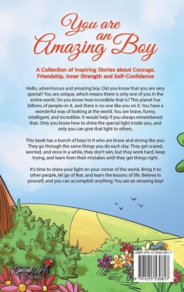 Hello, adventurous and amazing boy. Did you know that you are very special? You are unique, which means there is only one of you in the entire world. Do you know how incredible that is? This planet has billions of people on it, and there is no one like you on it. You have a wonderful way of looking at the world. You are brave, funny, intelligent, and incredible. It would help if you always remembered that. Only you know how to shine the special light inside you, and only you can give that light to others. This book has a bunch of boys in it who are brave and strong like you. They go through the same things you do each day. They get scared, worried, and once in a while, they don't win, but they work hard, keep trying, and learn from their mistakes until they get things right. It's time to shine your light on your corner of the world. Bring it to other people, let go of fear, and learn the lessons of life. Believe in yourself, and you can accomplish anything. You are an amazing boy! What you will find in this book: 10 Inspiring Stories for Boys about self-esteem, courage, inner strength, and self-love. A simple and engaging writing style suitable for both shared and independent reading Identification with the characters, who are always combined with themes from children's real lives Beautiful images to accompany the reading and stimulate the imagination Morals and Messages of Life with reflections and involvement in the narrative Boys love this book and it helps them to: Develop confidence in themselves and their abilities Cope better with difficult situations Never give up and do not be discouraged by small failures Believe in their dreams Understanding the importance of relationships with parents and friends Be curious and follow their passions 2 Bonus for You that you can download from the Special Art official website: Dreams Journal for Kids (PDF) Motivational Phrases Coloring Book for Kids (PDF) Click on ""buy now"" and help a boy believe in himself! (A Perfect Gift Idea)
