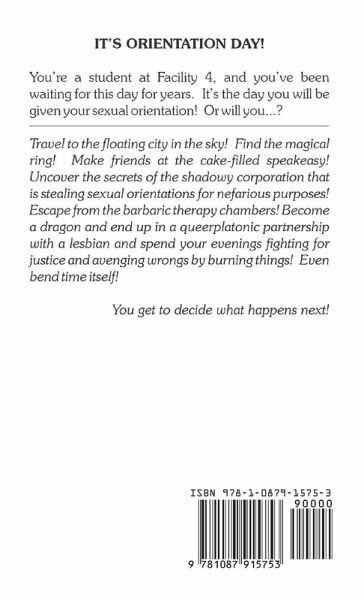 IT'S ORIENTATION DAY! You're a student at The Consortium's Facility 4, and you've been waiting for this day for years. It's the day you will be given your sexual orientation! But something happens during the procedure... You feel nothing as spontaneous amorous cavorting breaks out all around you. You flee the room, dodging attempted kisses and parrying awkward hugs, barely managing to keep your jumpsuit fully zipped. You catch your breath in the hall outside... ...and what happens next is up to you! A floating sky city! A magical ring! An army of crows! A dragon-riding, vengeance-seeking Lesbian! A cake themed asexual speakeasy! A fatal car chase! And the nefarious Consortium, hiding the truth behind Orientation Day! You get to choose! Where will your journey take you?