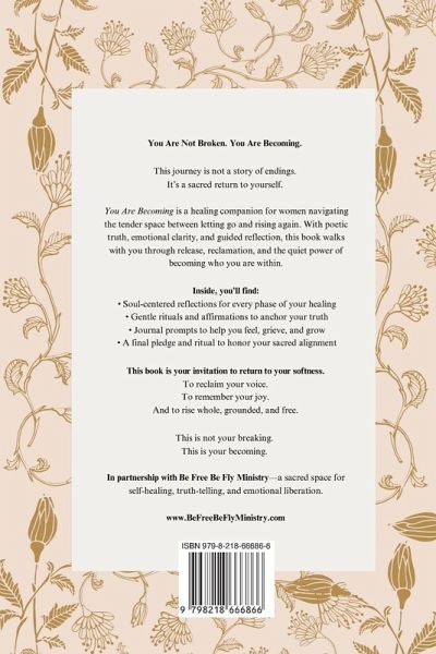 You Are Becoming is more than a self-help book; it's a healing companion for women navigating the tender space between letting go and rising again. Whether releasing a relationship, rediscovering your voice, or returning to yourself after a season of silence, this sacred guide offers you gentle truth, reflection, and ritual. With eleven soul-centered chapters, You Are Becoming weaves poetic wisdom, journal prompts, and spiritual practices to help you: Reclaim your voice after emotional disconnection Trust your intuition and honor your boundaries Forgive without losing your softness Remember joy and walk in sacred alignment Choose peace as a daily lifestyle, not just a destination Each page mirrors a moment, holds a message, and reminds you that you are not broken; you are Becoming. This book is your return to your power, softness, and sacred truth.