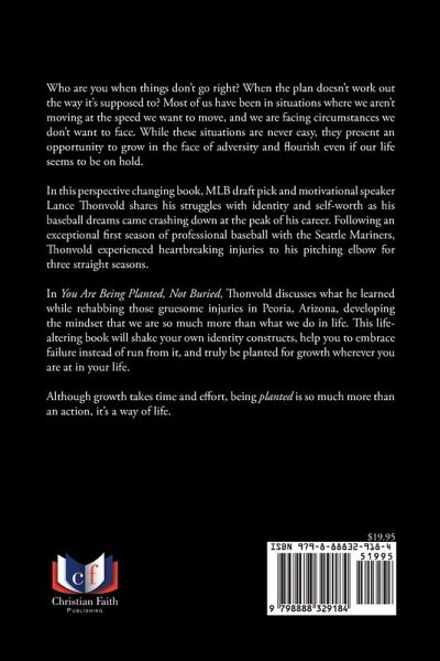 Who are you when things don't go right? When the plan doesn't work out the way it's supposed to? Most of us have been in situations where we aren't moving at the speed we want to move, and we are facing circumstances we don't want to face. While these situations are never easy, they present an opportunity to grow in the face of adversity and flourish even if our life seems to be on hold. In this perspective changing book, MLB draft pick and motivational speaker Lance Thonvold shares his struggles with identity and self-worth as his baseball dreams came crashing down at the peak of his career. Following an exceptional first season of professional baseball with the Seattle Mariners, Thonvold experienced heartbreaking injuries to his pitching elbow for three straight seasons. In You Are Being Planted, Not Buried, Thonvold discusses what he learned while rehabbing those gruesome injuries in Peoria, Arizona, developing the mindset that we are so much more than what we do in life. This life-altering book will shake your own identity constructs, help you to embrace failure instead of run from it, and truly be planted for growth wherever you are at in your life. Although growth takes time and effort, being planted is so much more than an action, it's a way of life.