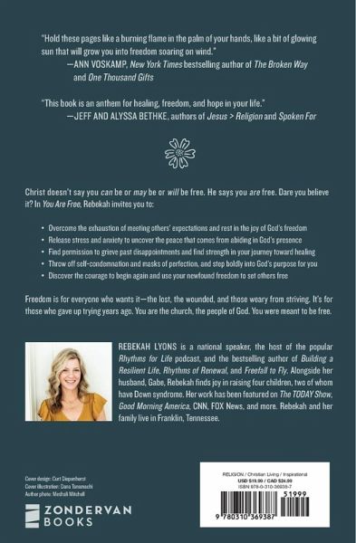 You don't have to keep striving for freedom. You can live into the freedom you already have in Christ. In You Are Free, Rebekah Lyons--author of Rhythms of Renewal--reveals her journey of releasing stress, anxiety, and worry to uncover the peace that comes from Jesus Christ. Have you bought into the lie? So many of us do. We measure our worth by what others think of us. We compare and strive, living our lives for the approval of others. Pressure rises, fear and anxiety creeps in, and we hustle to keep up. But Jesus tells us that he gave his life to set us free, giving us purpose and calling us to live in that God-given freedom and purpose. Maybe we're afraid to live in this truth because we can't even believe it. Rebekah reminds us that Christ doesn't say we can be or may be or will be free. He says we are free. Do you dare to believe it? In You Are Free, Rebekah invites you to: * Overcome the exhaustion of trying to meet others' expectations and rest in the joy that God's freedom brings * Find permission to grieve past experiences, confess your areas of brokenness, and receive strength in your journey toward healing * Throw off self-condemnation and step boldly into what our good God has for you * Discover the courage to begin again and use your newfound freedom to set others free Freedom is for everyone who wants it--the lost, the wounded, and those weary from all of the striving. It's for those of us who gave up trying years ago and for those of us who are angry and hurt, burnt out by the Christian song and dance. You are the church, the people of God. You were meant to be free. Join Rebekah as she helps you discover the freedom that comes when we learn that God is enough.