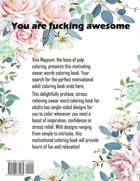 You Are Fucking Awesome: A Motivating Swear Word Coloring Book for Adults Viva Magnum, the boss of pulp coloring, presents this motivating swear words coloring book. Your search for the perfect motivational adult coloring book ends here, This delightfully profane, stress relieving swear word coloring book for adults has single-sided designs for you to color whenever you need a boost of inspiration, confidence or stress relief. With designs ranging from simple to intricate, this motivational coloring book will provide hours of fun and relaxation!