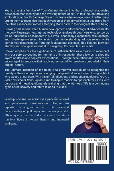 In You Are Just a Version of Your Original, author Sandeep Chavan embarks on a journey to illuminate the intricate relationship between our evolving selves and the essence we carry within. This book seeks to address a timeless question: who are we beneath the layers of versions we adopt throughout our lives? With a background in engineering and teaching, Chavan brings a unique perspective that fuses philosophy, psychology, and human nature to explore what it means to "version" ourselves as we grow. The book presents the idea that each of us, like evolving technology, embodies numerous versions that form over time in response to experiences, relationships, and the changing world. Yet, while technology often upgrades to reach an ideal functionality, humans are on a different path-a cyclical journey of transformation, adaptation, and rediscovery, guided by an original self that lies within our subconscious. As humanity advances, author makes the intriguing parallel between our own development and technological growth, particularly with artificial intelligence. Technology, he suggests, is a reflection of our ingenuity and adaptability but remains a tool in our hands, never a replacement for the human experience. This book reminds readers that true growth lies not in "perfecting" oneself but in moving fluidly between change and reconnection with our core essence. At the heart of the book, author encourages readers to adopt practices like self-reflection, mindfulness, and introspection as tools to "reset." Through these resets, we can temporarily strip away the accumulated layers, discover aspects of ourselves that may be dormant, and come closer to understanding our purpose. By doing so, we do not regress; instead, we access a state of genuine presence that illuminates our path forward. Sandeep Chavan wrote You Are Just a Version of Your Original to offer a perspective that embraces the balance between transformation and constancy. The author's intention is to guide readers toward a deeper awareness of their own cyclical journey, helping them recognize that each version is a step in a larger, meaningful rhythm of life. The book encourages readers to accept the shifts and versions they encounter as expressions of both resilience and purpose, underscoring that the ultimate goal is not to settle on an "ideal" self but to keep evolving while remaining rooted in the unchanging essence that defines who we are. In a world advancing rapidly, Chavan's work reminds us that our versions, when viewed through this lens, are opportunities for rediscovery and growth. By reconnecting with our original selves, we can navigate the journey of life with intention, understanding that true fulfillment comes from honoring both the journey forward and the return to our core essence.