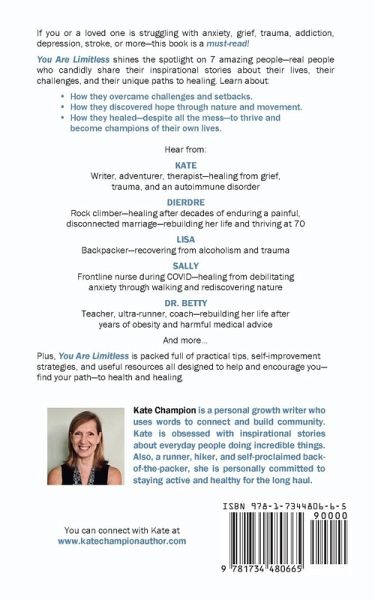 If you or a loved one is struggling with anxiety, grief, trauma, addiction, depression, stroke, or more-this book is a must-read!You Are Limitless shines the spotlight on 7 amazing people-real people who candidly share their inspirational stories about their lives, their challenges, and their unique paths to healing. Learn about:How they overcame challenges and setbacks.How they discovered hope through nature and movement.How they healed-despite all the mess-to thrive and become champions of their own lives.Hear from:Kate - writer, adventurer, therapist-healing from grief, trauma, and an autoimmune disorderDierdre - Rock climber-healing after decades of enduring a painful, disconnected marriage-rebuilding her life and thriving at 70Lisa - Backpacker-recovering from alcoholism and traumaSally - Frontline nurse during COVID-healing from debilitating anxiety through walkingand rediscovering natureDr. Betty - Teacher, ultra-runner, coach-rebuilding her life after years of obesity andharmful medical adviceAnd more...Plus,You Are Limitless is packed full of practical tips, self-improvement strategies, and useful resources all designed to help and encourage you-find your path-to health and healing.