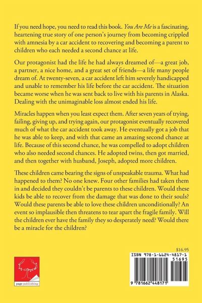 If you need hope, you need to read this book. You Are Me is a fascinating, heartening true story of one person's journey from becoming crippled with amnesia by a car accident to recovering and becoming a parent to children who each needed a second chance at life. Our protagonist had the life he had always dreamed of-a great job, a partner, a nice home, and a great set of friends-a life many people dream of. At twenty-seven, a car accident left him severely handicapped and unable to remember his life before the car accident. The situation became worse when he was sent back to live with his parents in Alaska. Dealing with the unimaginable loss almost ended his life. Miracles happen when you least expect them. After seven years of trying, failing, giving up, and trying again, our protagonist eventually recovered much of what the car accident took away. He eventually got a job that he was able to keep, and with that came an amazing second chance at life. Because of this second chance, he was compelled to adopt children who also needed second chances. He adopted twins, then got married, and then together with husband, Joseph, adopted more children. These children came bearing the signs of unspeakable trauma. What had happened to them? No one knew. Four other families had taken them in and decided they couldn't be parents to these children. Would these kids be able to recover from the damage that was done to their souls? Would these parents be able to love these children unconditionally? An event so implausible then threatens to tear apart the fragile family. Will the children ever have the family they so desperately need? Would there be a miracle for the children?