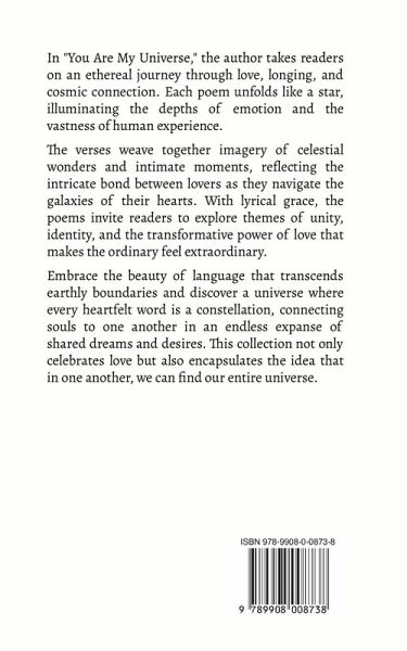 In "You Are My Universe," the author takes readers on an ethereal journey through love, longing, and cosmic connection. Each poem unfolds like a star, illuminating the depths of emotion and the vastness of human experience. The verses weave together imagery of celestial wonders and intimate moments, reflecting the intricate bond between lovers as they navigate the galaxies of their hearts. With lyrical grace, the poems invite readers to explore themes of unity, identity, and the transformative power of love that makes the ordinary feel extraordinary. Embrace the beauty of language that transcends earthly boundaries and discover a universe where every heartfelt word is a constellation, connecting souls to one another in an endless expanse of shared dreams and desires. This collection not only celebrates love but also encapsulates the idea that in one another, we can find our entire universe.