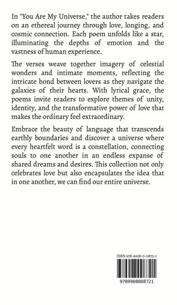 In "You Are My Universe," the author takes readers on an ethereal journey through love, longing, and cosmic connection. Each poem unfolds like a star, illuminating the depths of emotion and the vastness of human experience. The verses weave together imagery of celestial wonders and intimate moments, reflecting the intricate bond between lovers as they navigate the galaxies of their hearts. With lyrical grace, the poems invite readers to explore themes of unity, identity, and the transformative power of love that makes the ordinary feel extraordinary. Embrace the beauty of language that transcends earthly boundaries and discover a universe where every heartfelt word is a constellation, connecting souls to one another in an endless expanse of shared dreams and desires. This collection not only celebrates love but also encapsulates the idea that in one another, we can find our entire universe.