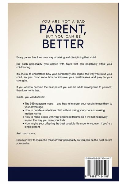 You're already a good parent... but here's how you can be even better: Do you keep doubting your parenting abilities because it seems like every time you try harder, you also fail harder? Do you see yourself as a bad parent whenever you make mistakes? Do you wonder what really makes someone a good or a bad parent? It's normal to feel this way - parenting is never easy. But it doesn't mean you're a bad parent. You're doing everything you can to give your child the best life possible. The fact that you're looking for ways to improve your parenting shows that you are already good enough - because you want to help your kid thrive in life. Every parent has their own way of raising their offspring. You have your own style of disciplining them while making them feel loved at the same time. But each personality type comes with flaws that can negatively affect your childrearing. It's crucial to understand how your Enneagram parenting personality can impact the way you bring up your child so you know how to improve your weaknesses and play to your strengths. That way, you can be at your best in nurturing your child without any "what ifs." If you want to become the best parent you can be while staying true to yourself, then look no further. Inside this positive parenting book, you will discover:The 9 Enneagram personality types - and how to interpret your results to use them to your advantage How to handle a rebellious child without losing your cool and making matters worse How to cultivate a growth mindset so you will not be hard on yourself and the rest of your family How to manage different parenting styles in your household without drama or conflicts Why yelling at your child can be just as bad as spanking them - and 3 steps you can take to stop yelling How to make peace with your childhood trauma so it will not negatively impact the way you raise your kids Why you need to know your parenting purpose - and 7 crucial questions you should ask yourself to discover it How to help your child cope with outbursts without being too harsh What to do to make your kid feel valued and cared for, even if you're a working parent 3 steps to raising a child with a disability - make them feel loved with gentle parenting so they can grow up feeling strong and secure How to give your kid the best possible life experience, even if you're a single parent And much more. The strategies in this parent guide book are applicable to children of all ages, from infants and teens to grown-up kids. This book is not meant to dictate what you should do, but rather to help you develop self-awareness so you can overcome guilt, frustrations, and self-doubt as a parent... and be able to raise your kid without giving in to society's pressures.If you want to know how to make the most of your personality so you can be the best parent you can be, then hit the BUY button right now.