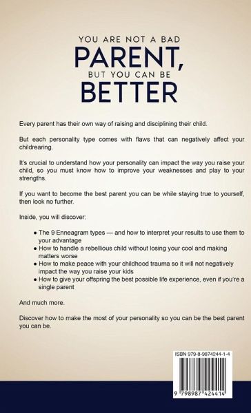 This is NOT just another BORING parenting book! Get ready to dive into the real YOU by discovering your Enneagram parenting type. You're already a good parent... but here's how you can be even better with the power of the Enneagram: Do you keep doubting your parenting abilities because it seems like every time you try harder, you also fail harder? Do you see yourself as a bad parent whenever you make mistakes? Do you wonder what really makes someone a good or a bad parent? It's normal to feel this way - parenting is never easy. But it doesn't mean you're a bad parent. You're doing everything you can to give your child the best life possible. The fact that you're looking for ways to improve your parenting shows that you are already good enough - because you want to help your child thrive in life. Every parent has their own way of raising their offspring. You have your own style of disciplining them while making them feel loved at the same time. But each personality type comes with flaws that can negatively affect your childrearing. It's crucial to understand how your personality can impact the way you bring up your child so you know how to improve your weaknesses and play to your strengths. That way, you can be at your best in nurturing your child without any "what ifs." If you want to become the best parent you can be while staying true to yourself, then look no further. Inside, you will discover:The 9 Enneagram types - and how to interpret your results to use them to your advantage How to handle a rebellious child without losing your cool and making matters worse How to cultivate a growth mindset so you will not be hard on yourself and the rest of your family How to manage different parenting styles in your household without drama or conflicts Why yelling at your child can be just as bad as spanking them - and 3 steps you can take to stop yelling How to make peace with your childhood trauma so it will not negatively impact the way you raise your kids Why you need to know your parenting purpose - and 7 crucial questions you should ask yourself to discover it How to help your child cope with outbursts without being too harsh What to do to make your kid feel valued and cared for, even if you're a working parent 3 steps to raising a child with a disability - make them feel loved so they can grow up feeling strong and secure How to give your kid the best possible life experience, even if you're a single parent And much more. The strategies in this guide are applicable to children of all ages, from infants and teens to grown-up kids. This book is not meant to dictate what you should do, but rather to help you develop self-awareness so you can overcome guilt, frustrations, and self-doubt as a parent... and be able to raise your kid without giving in to society's pressures.