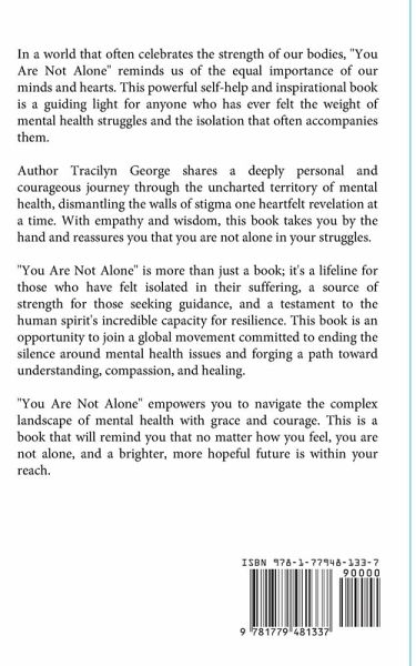 In a world that often celebrates the strength of our bodies, "You Are Not Alone" reminds us of the equal importance of our minds and hearts. This powerful self-help and inspirational book is a guiding light for anyone who has ever felt the weight of mental health struggles and the isolation that often accompanies them. Author Tracilyn George shares a deeply personal and courageous journey through the uncharted territory of mental health, dismantling the walls of stigma one heartfelt revelation at a time. With empathy and wisdom, this book takes you by the hand and reassures you that you are not alone in your struggles. "You Are Not Alone" is more than just a book; it's a lifeline for those who have felt isolated in their suffering, a source of strength for those seeking guidance, and a testament to the human spirit's incredible capacity for resilience. This book is an opportunity to join a global movement committed to ending the silence around mental health issues and forging a path toward understanding, compassion, and healing. "You Are Not Alone" empowers you to navigate the complex landscape of mental health with grace and courage. This is a book that will remind you that no matter how you feel, you are not alone, and a brighter, more hopeful future is within your reach.