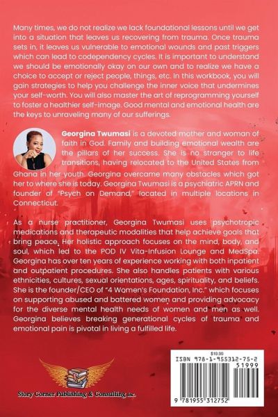 Many times, we do not realize we lack foundational lessons until we get into a situation that leaves us recovering from trauma. Once trauma sets in, it leaves us vulnerable to emotional wounds and past triggers which can lead to codependency cycles. It is important to understand we should be emotionally okay on our own and to realize we have a choice to accept or reject people, things, etc. In this workbook, you will gain strategies to help you challenge the inner voice that undermines your self-worth. You will also master the art of reprogramming yourself to foster a healthier self-image. Good mental and emotional health are the keys to unraveling many of our sufferings. Author's Bio Georgina Twumasi is a devoted mother and woman of faith in God. Family and building emotional wealth are the pillars of her success. She is no stranger to life transitions, having relocated to the United States from Ghana in her youth. Georgina overcame many obstacles which got her to where she is today. Georgina Twumasi is a psychiatric APRN and founder of "Psych on Demand," located in multiple locations in Connecticut. As a nurse practitioner, Georgina Twumasi uses psychotropic medications and therapeutic modalities that help achieve goals that bring peace. Her holistic approach focuses on the mind, body, and soul, which led to the POD IV Vita-Infusion Lounge and MedSpa. Georgina has over ten years of experience working with both inpatient and outpatient procedures. She also handles patients with various ethnicities, cultures, sexual orientations, ages, spirituality, and beliefs. She is the founder/CEO of "4 Women's Foundation, Inc." which focuses on supporting abused and battered women and providing advocacy for the diverse mental health needs of women and men as well. Georgina believes breaking generational cycles of trauma and emotional pain is pivotal in living a fulfilled life.