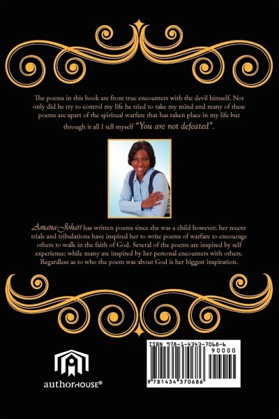 The poems in this book are from true encounters with the devil himself. Not only did he try to control my life he tried to take my mind and many of these poems are apart of the spiritual warfare that has taken place in my life but through it all I tell myself "You are not defeated".