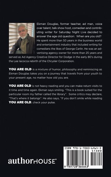 YOU ARE OLD is a mixture of humor, philosophy and reminiscing as Ekman Douglas takes you on a journey that travels from your youth to your present age, no matter how old you are. YOU ARE OLD is not heavy reading and you can make return visits to it time and time again. Ekman says smiling, "This is a book suited for the particular room my father called the library". Some critics may declare "That's where it belongs". He also says, "If you don't smile while reading YOU ARE OLD, check your pulse.