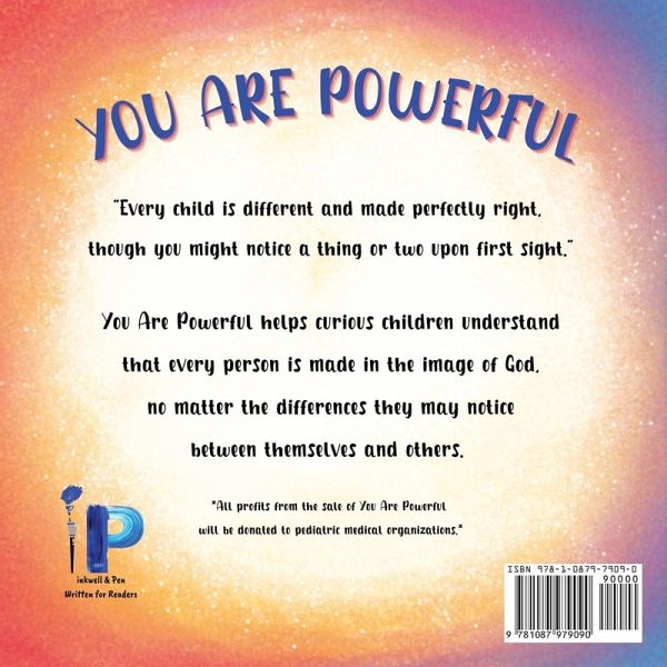 You Are Powerful helps curious children understand that every person is made in the image of God, no matter the differences they may notice between themselves and others. *Sales Profits donated to pediatric medical organizations.* "Every child is different and made perfectly right, though you might notice a thing or two upon first sight." Includes illustrations of children with various physical differences, such as hearing aids, forearm crutches, and glasses.