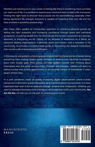 Whether just starting out in your career or feeling like there is something more out there you want out of life, it is possible to expand your world and learn to lead a life of purpose. Finding the right tools to discovers that purpose can be overwhelming, especially when facing significant life changes. Everyone is capable of impacting their own life and the lives of others in powerful, positive ways. Rob Grady offers readers an introductory approach to unlocking personal growth by asking the right questions and increasing confidence through grace and individual acceptance. In putting people first, he reintroduces the human component as a primary approach to everything we do. Calling on his decades of experience as a father, an executive leading organizations, a personal coach and mentor, and a volunteer in his community, he provides a multitool-style guide to discovering the deepest motivations that nourish a life of purpose and fulfillment. In this easy-to-use guide to unlocking personal potential, he shares stories of people doing everything from making drastic career changes to seeking new learnings to progress down their chosen path. Their stories will help readers uncover new thinking about themselves and the world around them. Through self-discovery, readers will learn to define success and pursue opportunities to be the best version of themselves in every aspect of their lives. In a post-pandemic world of rapidly increasing digital advancement where human connection is diminishing and information (and misinformation) is everywhere, it is more important than ever to be an example through purpose and compassion. Whether you want to manage a business, build a family, or set an example within your community, You Are the Key will start you on the path to unlocking your future.