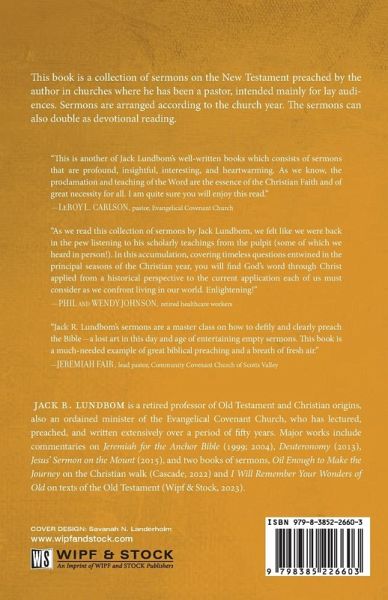 Jack R. Lundbom is a retired professor of Old Testament and Christian origins, also an ordained minister of the Evangelical Covenant Church, who has lectured, preached, and written extensively over a period of fifty years. Major works include commentaries on Jeremiah for the Anchor Bible (1999; 2004), Deuteronomy (2013), Jesus' Sermon on the Mount (2015), and two books of sermons, Oil Enough to Make the Journey on the Christian walk (Cascade, 2022) and I Will Remember Your Wonders of Old on texts of the Old Testament (Wipf & Stock, 2023).