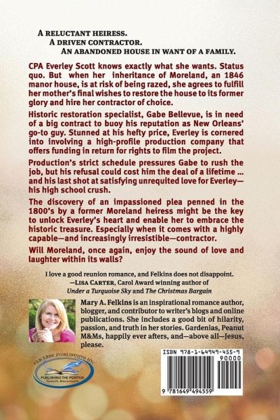 A reluctant heiress. A driven contractor. An abandoned house in want of a family. CPA Everley Scott knows exactly what she wants. Status quo. But when her inheritance of Moreland, an 1846 manor house, is at risk of being razed, she agrees to fulfill her mother's final wishes to restore the house to its former glory and hire her contractor of choice. Historic restoration specialist, Gabe Bellevue, is in need of a big contract to buoy his reputation as New Orleans' go-to guy. Stunned at his hefty price, Everley is cornered into involving a high-profile production company that offers funding in return for rights to film the project. Production's strict schedule pressures Gabe to rush the job, but his refusal could cost him the deal of a lifetime ... and his last shot at satisfying unrequited love for Everley-his high school crush. The discovery of an impassioned plea penned in the 1800's by a former Moreland heiress might be the key to unlock Everley's heart and enable her to embrace the historic treasure. Especially when it comes with a highly capable-and increasingly irresistible-contractor. Will Moreland, once again, enjoy the sound of love and laughter within its walls?