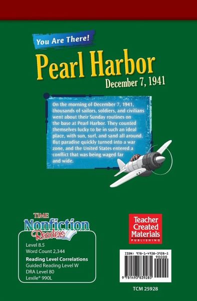 This intriguing nonfiction book builds literacy skills while immersing students in subject area content. You Are There! Pearl Harbor, December 7, 1941 examines the events leading up to the attack on Pearl Harbor, highlights the critical components, and details the aftermath and its effects. Developed by Timothy Rasinski and featuring TIME content, this high-interest book includes essential text features like an index, captions, glossary, and table of contents. The intriguing sidebars, detailed images, and in-depth Reader's Guide require students to connect back to the text and encourage multiple readings. The Think Link and Dig Deeper! sections develop students' higher-order thinking skills. The Check It Out! section includes suggested books, videos, and websites for further reading. Aligned with state standards, this text features complex and rigorous content appropriate for students preparing for college and career readiness.