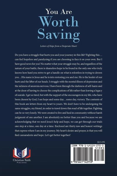 Do you have a struggle that hurts you and your journey in this life? Fighting this…can feel hopeless and paralyzing if you are choosing to face it on your own. But I have good news for you! No matter what your struggle may be, and regardless of the nature of your battle, there is shameless hope to be found in the only one who truly knows how hard you strive to get a handle on what is relentless in trying to drowned you…His name is Jesus and he is into restoring you and me. He is the healer of our hurts and the lifter of our heads. I struggle with the mental illness of depression and the sickness of anorexia nervosa. I have been through the darkness of self-harm and at the door of having to choose the complications of life rather than leaving a legacy of suicide. I get so tired, but with the support of the encouragers in my life, who have been chosen by God, I see hope and some day…some day, victory. The contents of this book are letters from my heart to yours. We don’t have to be undergoing the same struggles, my friend, in order to travel down this road of life together. Fighting can be so very lonely. We were created to live and heal in community without harsh judgment of one another. I am absolutely no better than you and because we are acknowledging that we need Jesus’s help and hope, we can get through our trials one step at a time, one day at a time. Enclosed are thirty raw and honest writings that express where I am in my journey. My heart’s desire and prayer, is that you will find camaraderie and hope. Let’s get better together!