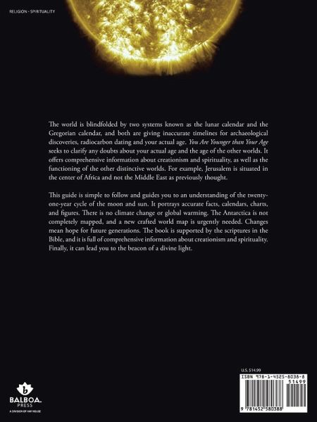 The world is blindfolded by two systems known as the lunar calendar and the Gregorian calendar, and both are giving inaccurate timelines for archaeological discoveries, radiocarbon dating and your actual age. You Are Younger than Your Age seeks to clarify any doubts about your actual age and the age of the other worlds. It offers comprehensive information about creationism and spirituality, as well as the functioning of the other distinctive worlds. For example, Jerusalem is situated in the center of Africa and not the Middle East as previously thought. This guide is simple to follow and guides you to an understanding of the twenty-one-year cycle of the moon and sun. It portrays accurate facts, calendars, charts, and figures. There is no climate change or global warming. The Antarctica is not completely mapped, and a new crafted world map is urgently needed. Changes mean hope for future generations. The book is supported by the scriptures in the Bible, and it is full of comprehensive information about creationism and spirituality. Finally, it can lead you to the beacon of a divine light.