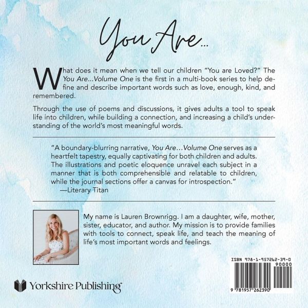 What does it mean when we tell our children "You are Loved?" The You Are...:Volume One is the first in a multi-book series to help define and describe important words such as love, enough, kind, and remembered. Through the use of poems and discussions, it gives adults a tool to speak life into children, while building a connection, and increasing a child's understanding of the world's most meaningful words.