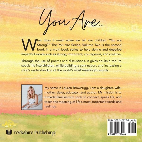 What does it mean when we tell our children "You are Loved?" The You Are...:Volume Two is the second in a multi-book series to help define and describe important words such as brave, strong, courageous, and creative. Through the use of poems and discussions, it gives adults a tool to speak life into children, while building a connection, and increasing a child's understanding of the world's most meaningful words.
