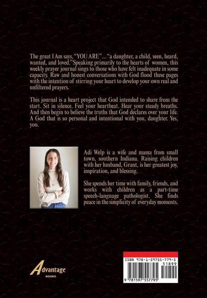 The great I am says, "YOU ARE"... "a daughter, a child, seen, heard, wanted, and loved." Speaking primarily to the hearts of women, this weekly prayer journal sings to those who have felt inadequate in some capacity. Raw and honest conversations with God flood these pages with the intention of stirring your heart to develop your own real and unfiltered prayers. This journal is a heart project that God intended to share from the start. Sit in silence. Feel your heartbeat. Hear your steady breaths. And then begin to believe the truths that God declares over your life. A God that is so personal and intentional with you, daughter. Yes, you.