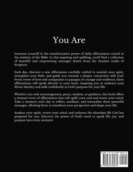 Immerse yourself in the transformative power of daily affirmations rooted in the wisdom of the Bible. In this inspiring and uplifting, you'll find a collection of heartfelt and empowering messages drawn from the timeless truths of Scripture. Each day, discover a new affirmation carefully crafted to nourish your spirit, strengthen your faith, and guide you towards a deeper connection with God. From verses of love and compassion to passages of courage and resilience, these affirmations will speak directly to your heart, inspiring you to embrace your divine identity and walk confidently in God's purpose for your life. Whether you seek encouragement, peace, wisdom, or guidance, this book offers a treasure trove of affirmations that will uplift your soul and renew your mind. Take a moment each day to reflect, meditate, and internalize these powerful messages, allowing them to transform your perspective and shape your life. Awaken your spirit, renew your mind, and embrace the abundant life God has prepared for you. Discover the power of God's word to speak life, joy, and purpose into every moment.