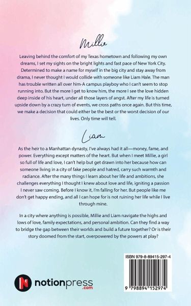Millie Leaving behind the comfort of my Texas hometown and following my own dreams, I set my sights on the bright lights and fast pace of New York City. Determined to make a name for myself in the big city and stay away from drama, I never thought I would collide with someone like Liam Hale. The man has trouble written all over him-A campus playboy who I can't seem to stop running into. But the more I get to know him, the more I see the love hidden deep inside of his heart, under all those layers of angst. After my life is turned upside down by a crazy turn of events, we cross paths once again. But this time, we make a decision that could either be the best or the worst decision of our lives. Only time will tell. Liam As the heir to a Manhattan dynasty, I've always had it all-money, fame, and power. Everything except matters of the heart. But when I meet Millie, a girl so full of life and love, I can't help but get drawn into her because how can someone living in a city of fake people and hatred, carry such warmth and radiance. After the many things I learn about her life and ambitions, she challenges everything I thought I knew about love and life, igniting a passion I never saw coming. Before I know it, I'm falling for her. But people like me don't get happy ending, and all I can hope for is not ruining her life while I live through mine. In a city where anything is possible, Millie and Liam navigate the highs and lows of love, family expectations, and personal ambition. Can they find a way to bridge the gap between their worlds and build a future together? Or is their story doomed from the start, overpowered by the powers at play?
