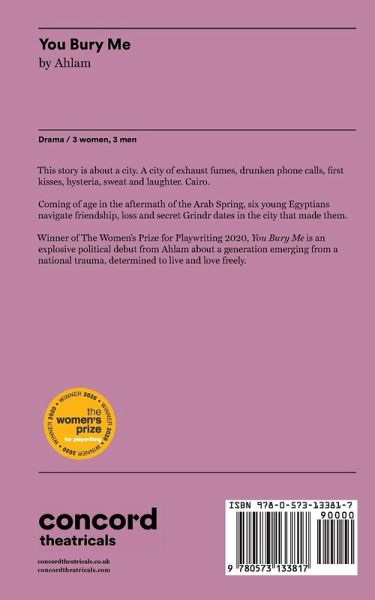 This story is about a city. A city of exhaust fumes, drunken phone calls, first kisses, hysteria, sweat and laughter. Cairo. Coming of age in the aftermath of the Arab Spring, six young Egyptians navigate friendship, loss and secret Grindr dates in the city that made them. Winner of The Women's Prize for Playwriting 2020, You Bury Me is an explosive political debut from Ahlam about a generation emerging from a national trauma, determined to live and love freely.